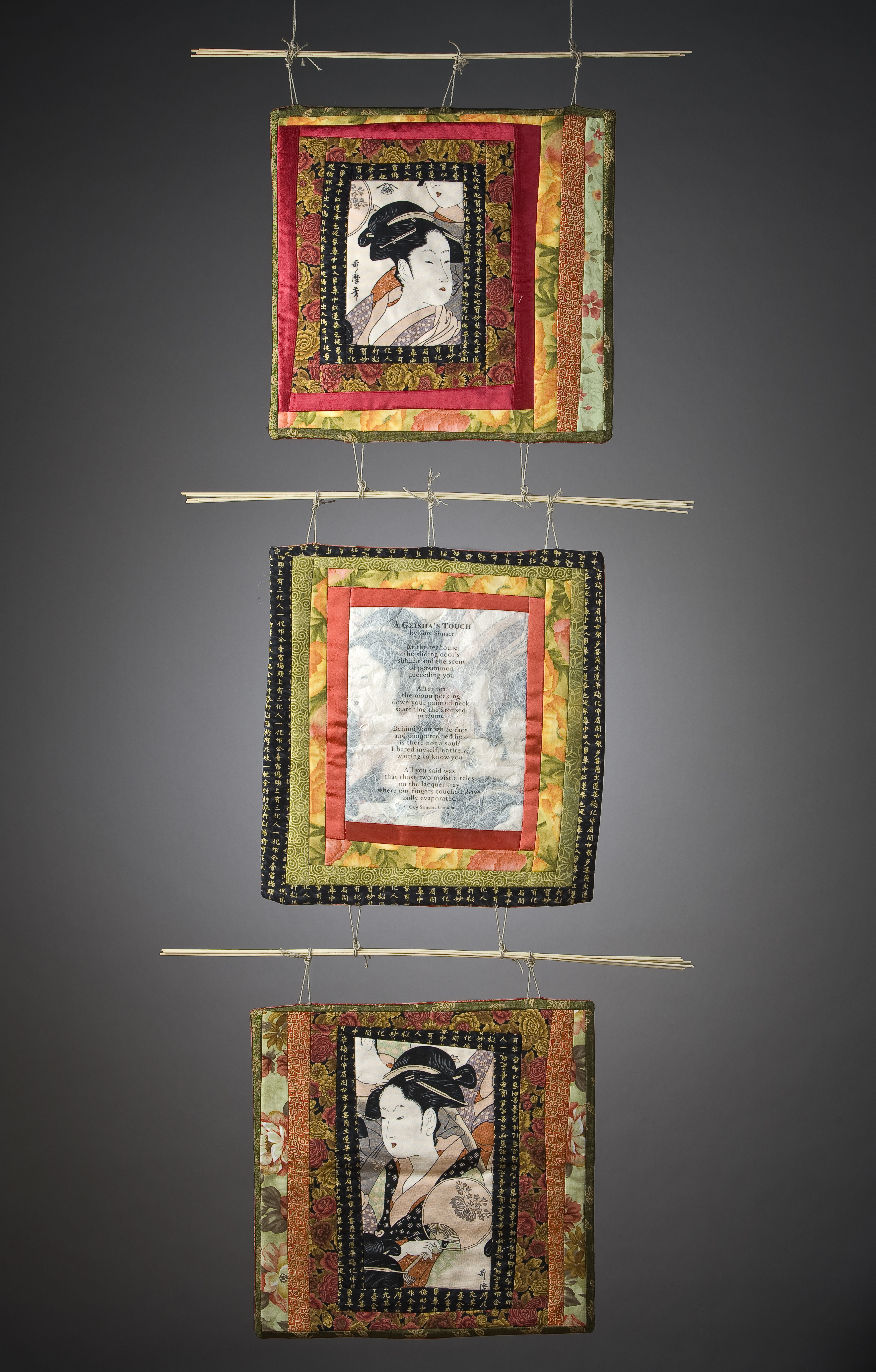 Geisha Geisha Wall hanging created for the North American Haiku Conference, Toronto, Canada. Poem, Geisha, by Guy Simser, printed on handmade paper. Loni Rossi cottons, cotton, velvet, satin. Private collection. Share this: Click to share on X (Opens in new window) X Click to share on Facebook (Opens in new window) Facebook More Click to share on LinkedIn (Opens in new window) LinkedIn Click to share on Tumblr (Opens in new window) Tumblr Click to share on Reddit (Opens in new window) Reddit Click to email a link to a friend (Opens in new window) Email Like Loading...