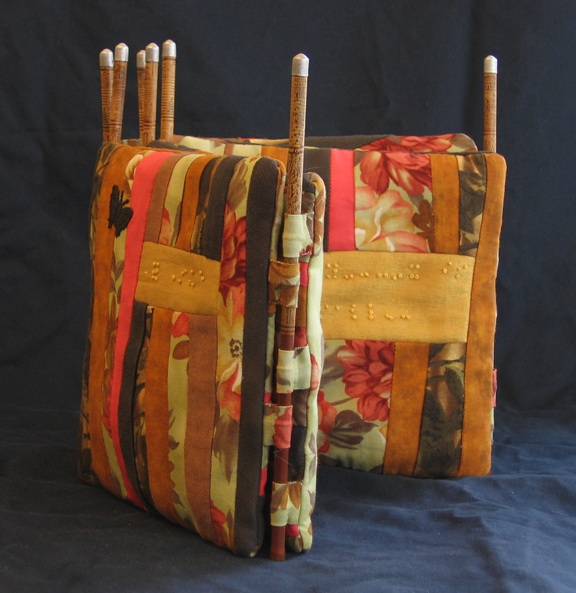 Pillow book for Sue – Braille Pillow book for Sue – Braille This book was made for my friend, Sue, who is blind. The text in the gold boxes is Braille (French knots). The fabrics are cotton, silk, satin, velvet and linen. The pillows are stuffed with balsam to create a sensory experience. Private collection. Pillow book for Sue – view 2 Share this: Click to share on X (Opens in new window) X Click to share on Facebook (Opens in new window) Facebook More Click to share on LinkedIn (Opens in new window) LinkedIn Click to share on Tumblr (Opens in new window) Tumblr Click to share on Reddit (Opens in new window) Reddit Click to email a link to a friend (Opens in new window) Email Like Loading...